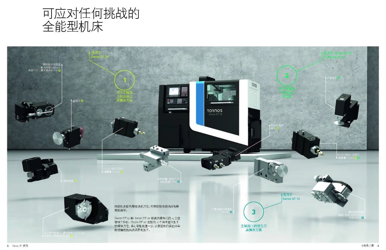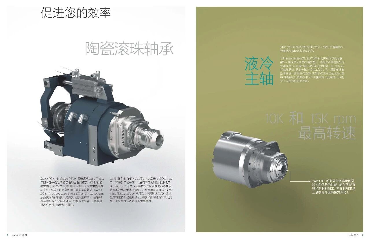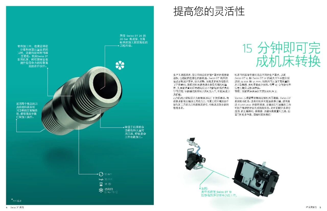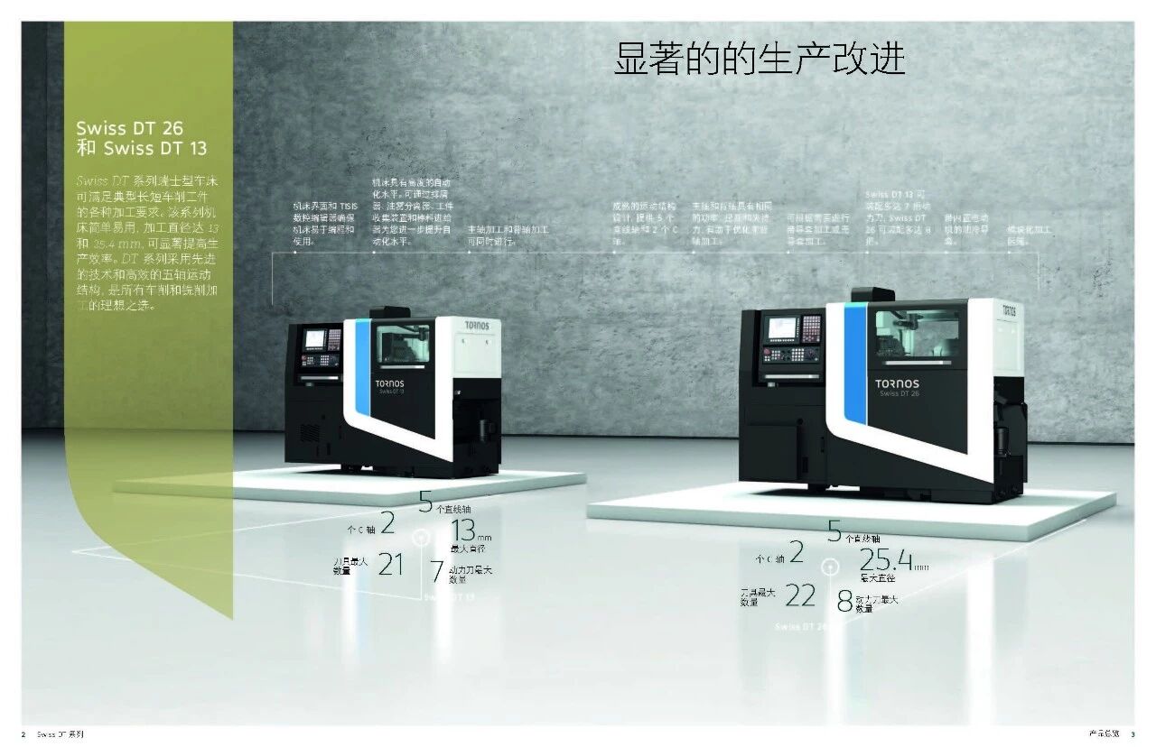 Swiss DT 系列瑞士型車床專業(yè)設(shè)計(jì)滿足典型長(zhǎng) 短車削工件的各種要求。該系列機(jī)床簡(jiǎn)單易 用,加工直徑達(dá) 13 和 25.4 mm,可顯著提高生 產(chǎn)效率。Swiss DT 系列采用先進(jìn)的技術(shù)和高效的五軸運(yùn)動(dòng)結(jié)構(gòu),是所有車削和銑削加工的理想之選。